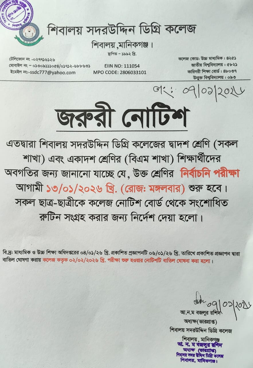 #নোটিশ #নির্বাচনি পরীক্ষা-২০২৬ শুরু হবে ১৩/০১/২০২৬ খ্রি. থেকে