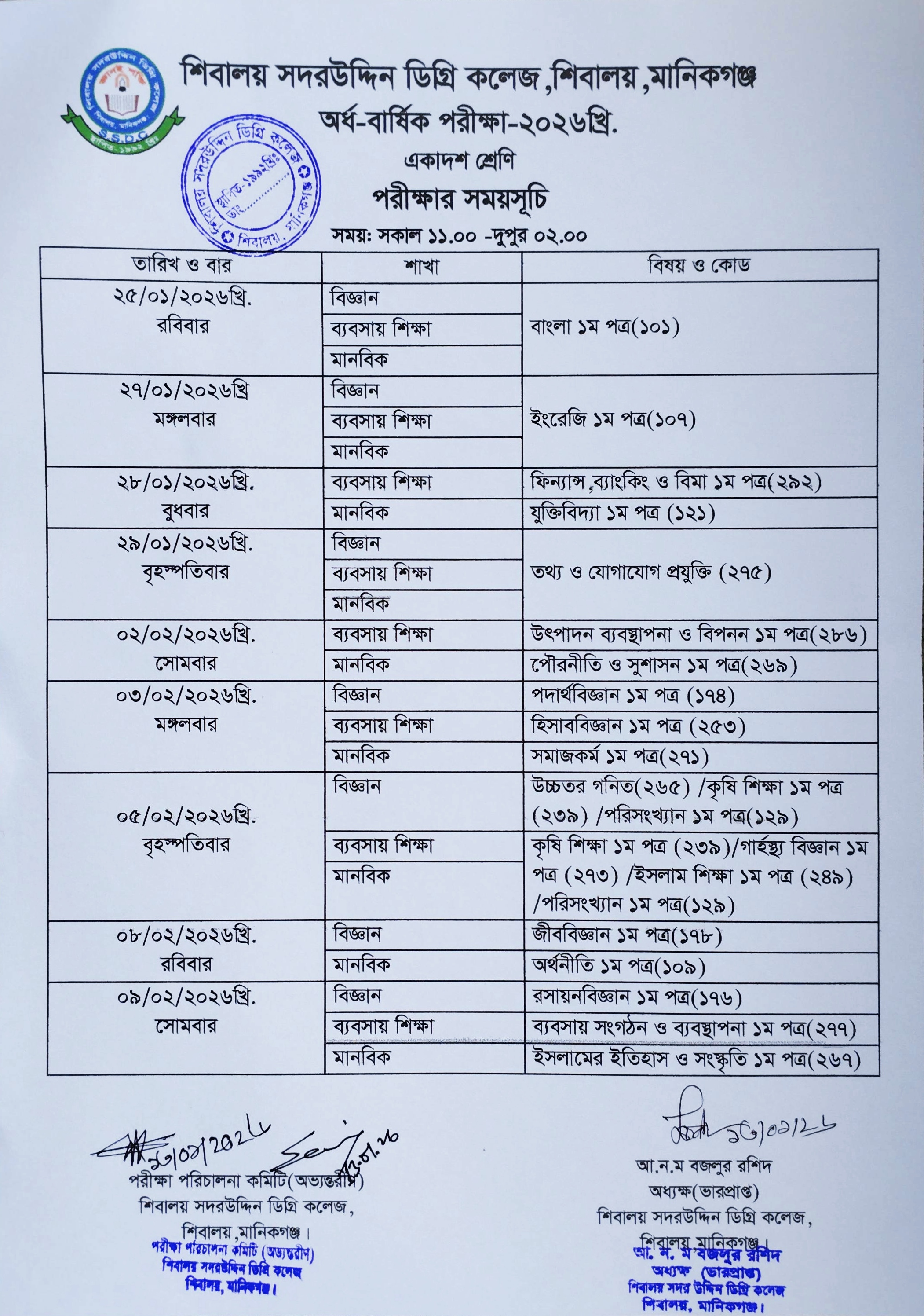 #নোটিশ #একাদশ শ্রেণির(বিজ্ঞান, ব্যবসায় শিক্ষা ও মানবিক শাখা) অর্ধবার্ষিক পরীক্ষা ২০২৬ এর রুটিন #পরীক্ষা শুরু ২৫/০১/২০২৬ খ্রি., রোজ:রবিবার